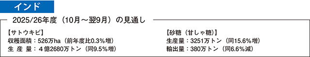 砂糖生産量は、主要生産州であるマハラシュトラ州、ウッタル・プラデーシュ州およびカルナータカ州でのサトウキビの増産と歩留まり(糖回収率)の上昇により、3251万トン(同15.6%増)とかなり大きな増加が見込まれている。一方、砂糖輸出量は、世界の砂糖相場下落により、380万トン(同6.6%減)とかなりの程度減少が見込まれている。