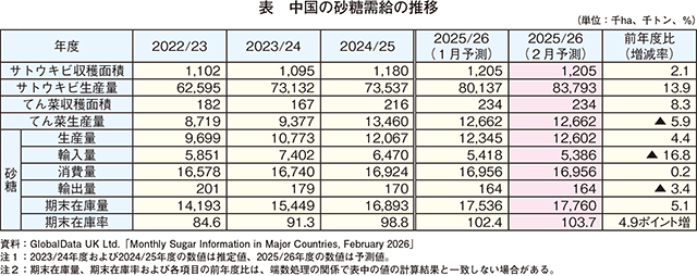 2025/26年度(10月〜翌9月)のサトウキビの収穫面積は、競合作物よりも収益性が高いことから生産者が作付けを増加させたことで、121万ヘクタール(前年度比2.1%増)とわずかな増加が見込まれている(表)。サトウキビ生産量は、主産地である広西チワン族自治区や雲南省での収穫開始が遅れたが、サトウキビの生育は良好であるため、8379万トン(同13.9%増)とかなり大きな増加が見込まれている。