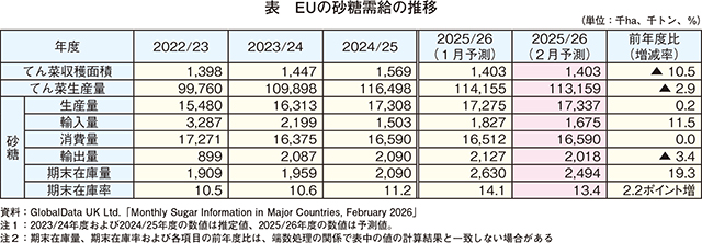 2025/26年度(10月〜翌9月)のてん菜収穫面積は、生産量上位国であるフランス、ドイツ、ポーランドを中心に各国で減少が見込まれることから、140万ヘクタール(前年度比10.5%減)とかなりの程度減少が見込まれている(表)。てん菜生産量は、フランスでは単収の向上、ドイツでは糖度の改善をそれぞれ見込んでいるものの、作付面積の減少により、1億1316万トン(同2.9%減)とわずかな減少が見込まれている。