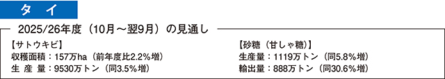 砂糖生産量は、サトウキビの増産により、1119万トン(同5.8%増)とやや増加が見込まれている。しかし、年末年始にかけての製糖工場における圧搾作業の中止やカンボジアとの国境閉鎖に伴う労働力確保の問題などで収穫および圧搾作業に遅延が発生していることから、累計での生産量は前年度を下回って推移している。砂糖輸出量は、ブラジル産の輸出量減少が見込まれている中、砂糖の増産を背景に888万トン(同30.6%増)と大幅な増加が見込まれている。