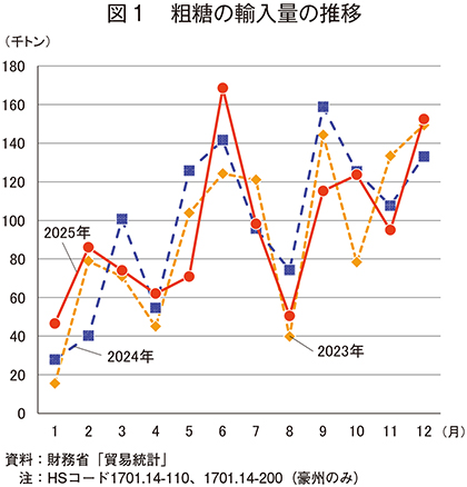 財務省「貿易統計」によると、2025年12月の甘しゃ糖・分蜜糖(HSコード 1701.14−110)および甘しゃ糖・その他(同1701.14−200の豪州、以下同じ)の輸入量は、15万2309トン(前年同月比14.5%増、前月比60.4%増)であった(図1)。