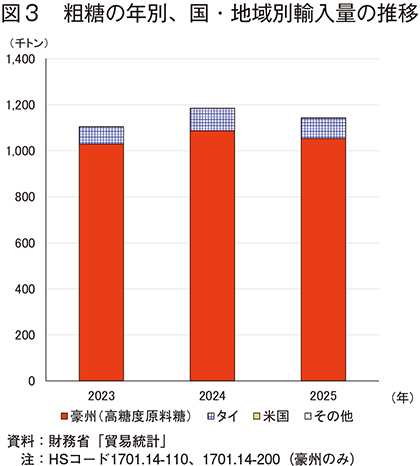 輸入先については、甘しゃ糖・分蜜糖は輸入実績が無く、甘しゃ糖・その他は豪州で、国・地域別の輸入量は次の通りであった(図2)。