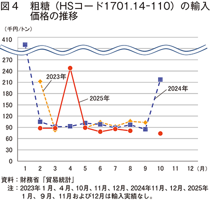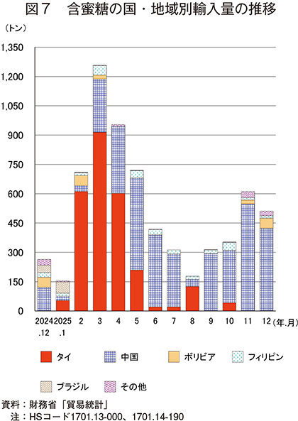 財務省「貿易統計」によると、2025年12月の含蜜糖(HSコード 1701.13−000、1701.14−190)の輸入量は、511トン(前年同月比93.6%増、前月比16.4%減)であった(図6)。