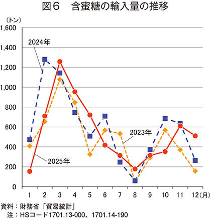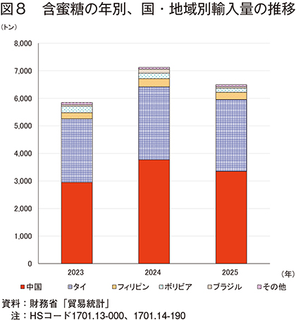 また、2025年1〜12月の含蜜糖の輸入量は、6493トン(前年比8.9%減)であった(図8)。