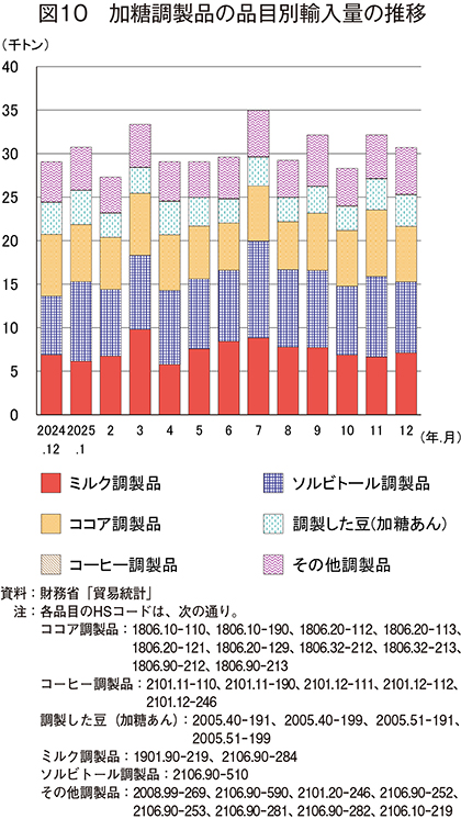 財務省「貿易統計」によると、2025年12月の加糖調製品の輸入量は、3万692トン(前年同月比5.6%増、前月比4.5%減)であった(図10)。