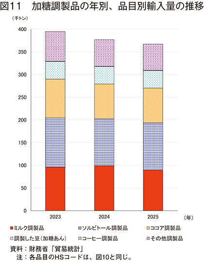 また、2025年1〜12月の加糖調製品の輸入量は、36万6674トン(前年比2.7%減)となった(図11)。