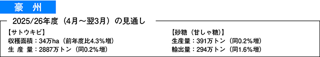 2025/26年度(4月〜翌3月)のサトウキビ収穫面積は、34万ヘクタール(前年度比4.3%増)とやや増加が見込まれている(表)。サトウキビ生産量は、23/24年度から継続して3000万トンを下回り、2887万トン(同0.2%増)と前年度並みが見込まれている。こうした中、豪州砂糖製造者協会(ASM)は、サトウキビ価格の下落で多くの製糖工場が赤字経営を強いられており、砂糖業界にとって厳しい年となった旨の声明を発表した。26/27年度の作付けは、25/26年度の収穫作業が例年と比較して早期に終了したことで開始が早まると見込まれている。