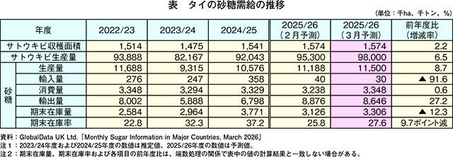 砂糖生産量は、サトウキビの増産とCCS(注)の上昇により、1150万トン(同8.7%増)とかなりの程度増加が見込まれている。しかし、年末年始にかけての製糖工場における圧搾作業の中止やカンボジアとの国境閉鎖に伴う労働力確保の問題などで収穫および圧搾作業に遅延が発生していることから、26年2月時点の累計生産量は前年度を下回って推移している。砂糖輸出量は、砂糖の増産を背景に865万トン(同27.2%増)と大幅な増加が見込まれている。