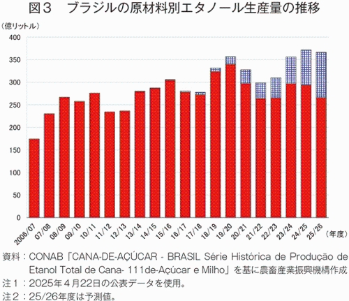 同国のエタノール生産に占めるサトウキビ由来の割合は約3割とされるが、同国の製糖企業によれば、サトウキビ由来のエタノール生産能力は2019/20エタノール年度(11月〜翌10月)の43億リットルから25/26エタノール年度には90億リットルへ倍増した。これにより、エタノール生産量は24/25年度時点で19%に到達し、E20達成の目標年が当初の30年から25/26エタノール年度に前倒しされた(図4)。また、サトウキビのエタノール向け転用の進展により、1)農家収益の改善、2)過剰生産による相場下落リスクの低減、3)年間170億ドル(2兆6577億円)の外貨節約、4)原油輸入2450万トンの削減、5)累計7360万トンのCO2削減−など多面的な効果が生じている。政府はCORSIA対応として、国内航空会社に対し国際線航空燃料へのSAF混合率を27/28年度までに1%、30年までに5%とする義務を課している。23年5月には、国内航空会社がインド石油公社株式会社(IOCL)などの協力の下、国産SAF1%混合燃料を使用した商業フライトを成功させている。砂糖関連企業を中心に、多くの国内企業がSAF投資に意欲的である。