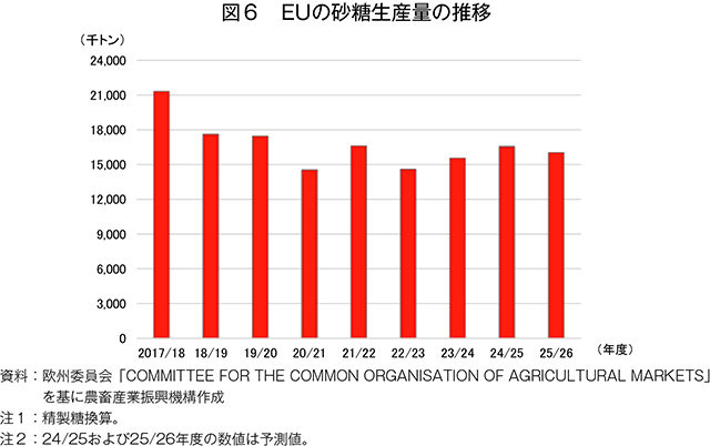 てん菜の作付面積は、砂糖相場が好調だった過去2年間には拡大したが、現在は世界的な過剰状態と相場低迷により減少傾向にある(図5)。2025/26年度の砂糖生産量は、世界の砂糖相場低迷に伴うEUの砂糖相場低迷により、てん菜作付面積が減少した結果、1603万トンと見込まれる(図6、7)。