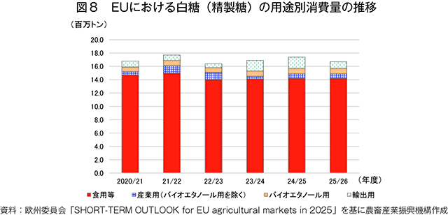 EUの砂糖消費は、砂糖と健康に関する議論の高まりにより、消費者が批判的な意見や印象を抱きやすい状況にあることなどから、特に食用を中心に減少傾向にある(図8)。一方、アフリカや東南アジアなど一部地域では、今後も砂糖の消費拡大が続くと見込んでいる。