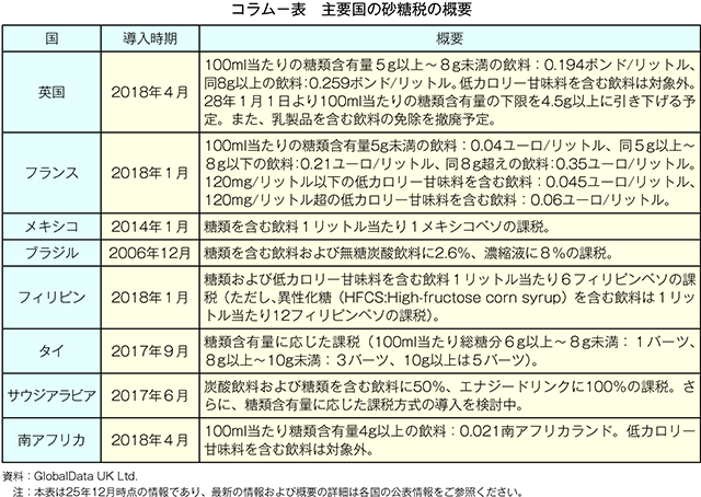 コラム 砂糖税をめぐる世界の状況世界保健機関(WHO)は2026年1月、「糖類を含む飲料税に関するグローバル報告書(Global report on the use of sugar-sweetened beverage taxes 2025)」を公表した。これによると、24年7月時点で、世界116カ国において1種類以上の糖類を含む飲料に国レベルの砂糖税(コラム注)が課されている(コラム−図)。(コラム注)一般的に糖類を含む飲料や食品に対する課税のこと。導入国ごとに税制の正式名称は異なる。 ![]() このうち、114カ国で糖類を含む炭酸飲料が課税対象となっている。地域別では、アフリカ地域で糖類を含む飲料への適用率が最も高く、対象47カ国の89.4%(42カ国)が導入している。これに続くのが東地中海地域(17カ国中13カ国:76.5%)、東南アジア地域(8カ国中6カ国:75%)、南北アメリカ地域(33カ国中22カ国:66.7%)、西太平洋地域(24カ国中12カ国:50%)、欧州地域(50カ国中21カ国:42.0%)である。また、所得階層別では、低所得国が最も高い適用率(21カ国中20カ国:95.2%)を示している。 報告書では、経済成長に伴う物価上昇の中で飲料価格が据え置かれた場合、糖類を含む飲料が一層手頃な価格となり、入手しやすさが高まることで消費増につながる点を指摘している。このような消費の拡大は、過体重や肥満の有病率と関連する要因と位置付けており、砂糖税などの税制政策は価格を引き上げ、入手しやすさを抑制する効果的な手段であるとしている。 以下に主要国の砂糖税の概要を取りまとめた(コラム−表)。 ![]() 一方、WHOが2015年に公表した「糖類摂取ガイドライン」は、「糖類の完全排除」ではなく、「健康リスクを避けるための上限設定」を目的としている。すなわち、「糖類はゼロにすべきもの」ではなく、「摂取量を適切に管理すべきもの」との立場である。また、糖類の中には砂糖のようにエネルギー源としての機能に加え、脳内の神経物質に働きかけてリラックス効果をもたらすなど、一定の有効性が報告されているものもある。問題となるのは、あくまでも「一定量を超えた過剰摂取」である。 他の食材の事例を見てみると、例えば乳製品のバターは、かつて健康への悪影響が懸念され、長く消費が伸び悩み、「脱脂粉乳の副産物」とまで言われた時期があったものの、14年に米「TIMES」誌で「バターの脂肪は健康に良い」との報告が紹介されたことなどを契機に、健康的な食材として再評価が進み、世界的に消費が拡大した例がある。 どのような食材であれ、過度な摂取が健康に影響を及ぼす可能性がある点は共通であり、砂糖税のような強い政策措置を通じて消費の削減を迫られる状況は、食生活や食文化が十分に機能しない兆候とも言えるのではないか。今後、研究や調査の進展によって砂糖を含む糖類が再評価される可能性もある。従って、その有効性や有益性、適切な摂取量など、科学的根拠に基づく正確な情報を発信することが求められている。 |