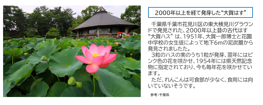また、千葉県千葉市の千葉公園では、2000年以上前のれんこんの種が発見され、その種から芽が出て今も毎年花を咲かせる「