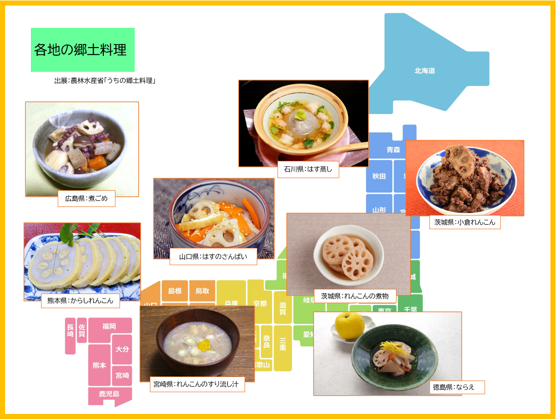 古くから日本で栽培されているれんこんは、穴が開いていることから「先(将来)を見通せる」という意味で、縁起が良いとされており、また、身近な食材として地域の食に根付いて発展してきました。
