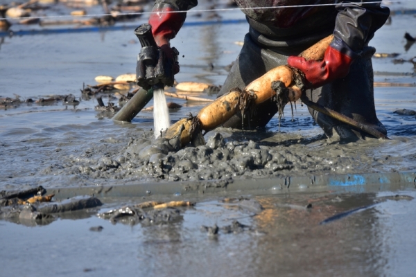 鍬掘り」があります。水掘りは、れんこんを傷つけないようポンプを使った水圧でれんこんを浮かび上がらせて収穫します。