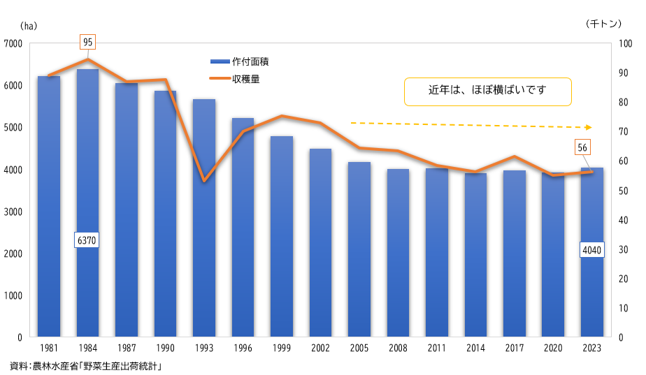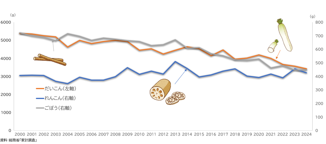 令和5年におけるれんこんの作付面積は4,040ha、収穫量は56千トンとなっています。1980年代以降減少しましたが、近年は一定の生産を維持しています。消費量から見てみても同じ根菜類のだいこん、ごぼうと比較すると、両者が減少傾向であるなかで、れんこんは横ばいで推移していることが分かります。