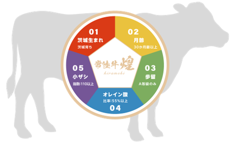 認定には、五つの条件「(1)茨城生まれ茨城育ち(2)月齢30カ月齢以上(3)歩留等級A等級のみ(4)オレイン酸比率55%以上(5)小ザシ