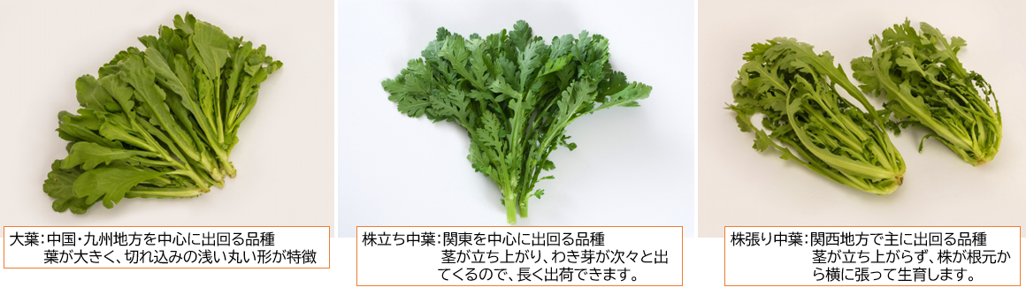 しゅんぎくの種類は、葉の大きさや切れ込み方によって、大葉種、中葉種、小葉種に大別されます。 大葉種は葉肉が厚く切れ込みが浅い丸葉に近い形で、中葉や小葉は切れ込みが深く薄い葉です。 近年は中葉種が主流ですが、関西から九州にかけては大葉種も出回ります。