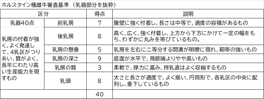 肢蹄」、「乳用強健性」、「乳器」の4つの区分があります。中でもホルスタインにとって最も重視されるのは「乳器」です。乳房の付着が強く、よく発達し、四乳区の均整が取れ、質が良く、長期にわたり高い生産能力を示すことが評価されます。