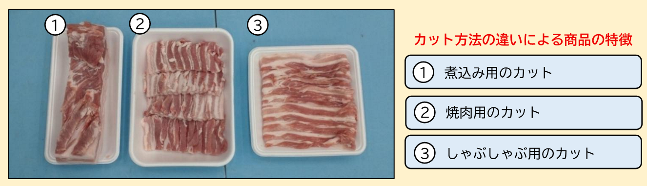 たとえば、脂肪が多くコクのある「豚バラ肉」、大きくカットすれば煮込み用、厚めなら焼肉用、薄くスライスすればしゃぶしゃぶ用になります。