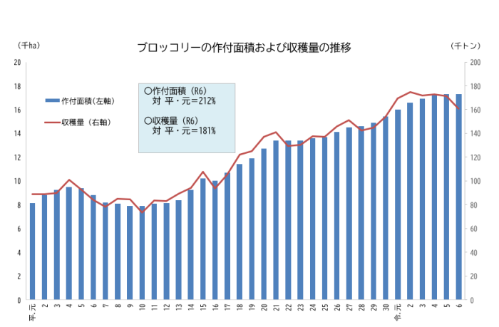 ブロッコリーの地位を、令和6年産品目別の作付面積と収穫量から見ると、作付面積は第9位、収穫量は16位となっています。そして、作付面積と収穫量の推移を見ると、年によって増減はあるものの近年大きく増加してきたことが分かります。多くの野菜の品目の生産量が減少するなかで、ブロッコリーは大きく伸びてきた数少ない品目です。