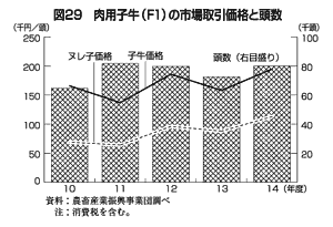 交雑種(F1)は、11年度まで取引頭数が大幅に増えたため、取引価格は9〜11年度にかけては前年を下回って推移した。12年度には再び上回ったが、13年度はBSEの影響でかなり大きく前年を下回った。しかし、14年度には19万5千円(23.6%)と前年を大幅に上回っただけでなく、BSE発生前(12年度)の水準も上回った。ヌレ子の取引価格も、13年度にはかなりの程度低下したが、14年度には11万3千円(27.6%)と回復した(図29、P.85)。 |