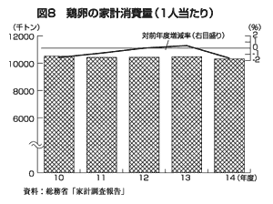 家計消費量も、近年ほぼ横ばいで推移している。11年度は、賞味期限等表示の実施等から前年度を上回る月もあったが、引き続き前年度を下回った。12年度以降は横ばいで、推移し、14年度は、景気後退の続く中で10,290g/人(▲1.6%)とわずかに減少した(図8、P.66)。 |