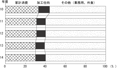 14年の鶏肉消費の構成割合は、家計消費33%、加工仕向11%、その他(業務用、外食等)56%となり、その他が4ポイント減少、家計消費と加工仕向けがそれぞれ2ポイントずつ増加した。(図15、P.67)。 |