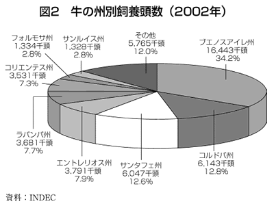 アルゼンチンの牛飼養頭数は9 4年以降減少傾向で推移している。9 4年に5 , 3 1 6万頭に達した牛飼養頭数(乳牛を含む)は、2 0 0 2年には4 , 8 0 6万頭となった。減少要因として、9 5年、9 6年の2 度の大きな干ばつと、9 8年のエルニーニョ現象による洪水の被害に加え、9 6年の穀物価格の高騰により肉牛生産から穀物生産への転換が増加したこと、国内経済の低迷などが挙げられる。2 0 0 2年の州別牛飼養頭数を見ると、パンパ地域に属するブエノスアイレス州(3 4%)、コルドバ州(1 3%)、サンタフェ州(1 3%)の3州で、全体の約6割を占める。
