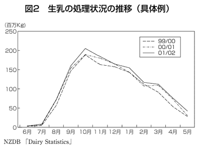N Zの酪農は、温暖で雨量に恵まれた自然条件を生かし、草地を最大限に利用した放牧中心の飼養形態である。このため、年間の生乳生産は、牧草の育成状況と密接に連携するため、初春となる8月から開始し、1 0〜1 2月の初夏をピークにその後次第に減少、5月には1シーズンを終えるという明確な季節型を示している。生乳生産の中心となる9〜2月の6ヵ月間で年間の約8割を生産する。