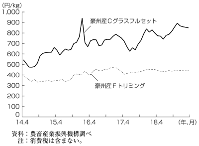 豪州産の主力である冷蔵フルセット(グラス)の卸売価格は、14年は輸入量の減少が続いたため、比較的堅調に推移した。その後、豪州での干ばつによる牛肉生産の停滞に伴う原地価格の上昇などを受けて、15年度には前年同月を上回り、16年度以降も米国でのBSE発生に伴う米国産の輸入一時停止により上昇傾向で推移した。18年度は、原産地価格の上昇などから年度平均で820円/kg(11.8%)とかなり大きく上昇した。 ハンバーグなどに使われる冷凍トリミングは、14年度には前年度をやや下回ったものの15年度は堅調に推移し、16年度には冷蔵品と同様、米国のBSEの影響により前年度を大幅に上回った。17年度は434円と前年度を3.3%下回ったものの、18年度は、年度平均で440円/kg(1.4%)となった(図21、P.176)。 |