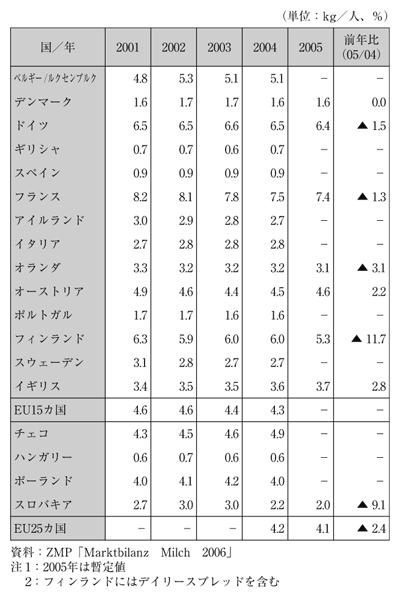 エ.チーズ チーズ生産量は、堅調な域内需要に加え、世界的な需要増加を背景に95年から2004年までの10年間で、EU15カ国で約16%増加した。99年には、ロシアの経済悪化による同国向け輸出の停滞の影響で一時的に生産の伸びが鈍化したものの、その後回復している。2001年には、BSE問題の再燃による代替需要生産の拡大により、最近では最大の伸びを示したが、その後落ち着き、2005年のEU25カ国の生産量は前年比1.5%増の857万3千トンとなった。このうち主に牛乳を原料として乳業工場で製造されるものは786万8千トン(マルタを除く)となっている。 |