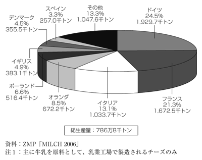 2005年のEUの生乳生産量は、全世界(約6億3,056万トン:FAO資料)の約23%を占め、これは、単一国としては世界最大であるインドの生産量の約1.5倍に相当する。EUは、牛乳・乳製品の自給率が117%の純輸出市場であり、国際乳製品市場に大きな影響力を持っている。2005年において、EUが世界の乳製品貿易量に占める割合は、チーズが34%、バターが36%、脱脂粉乳が18%で、いずれも世界最大となっている。 |