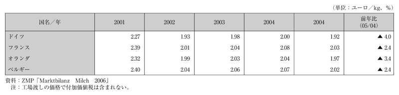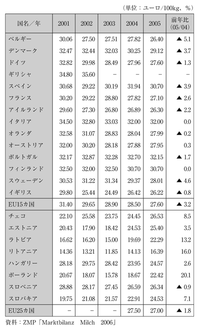 ア.生乳生産割当(クオータ)制度 この制度の終了年度は、「アジェンダ2000」において2007/08年度(毎年4月〜3月)と定められていたが、2003年6月に合意した共通農業政策(CAP)改革において、2014/15年度まで継続されることとなった。 イ.乳製品の介入買入れ バターの市場価格が介入価格(100キログラム当たり282.44ユーロ(2005年7月1日〜2006年6月30日))の92%を下回った場合、加盟国の介入機関により、入札方式による一定規格のバターの介入買い入れが行われる。なお、CAP改革により、バターの介入買入限度数量を新たに設定し、2004年に7万トン、その後毎年1万トンずつ削減し、2008年に3万トンまで削減することとなった。 また、一定規格の脱脂粉乳については、3月1日〜8月31日の間、加盟国の介入機関が介入価格(100キログラム当たり184.97ユーロ(2005年7月1日〜2006年6月30日))で買い入れる。なお、その年の介入買い入れ数量が10万9千トンを超えた場合、介入買い入れは停止され、入札による買い入れが実施できることとなっている。 ウ.酪農奨励金 なお、本奨励金は、CAP改革で導入された生産とリンクしない直接支払い(デカップリング)に2008年から統合されることとなっているが、加盟国はより早い時期に統合することができる。 エ.輸出補助金 オ.域内消費の促進 |