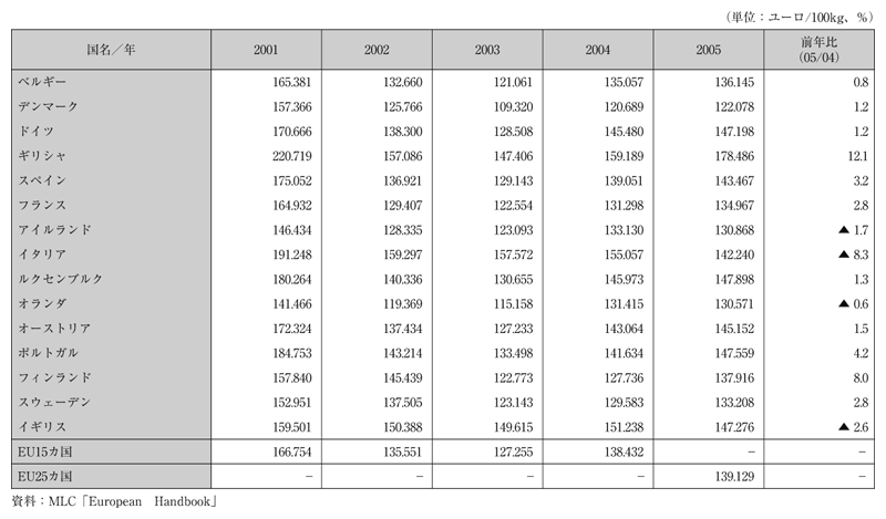 ア.豚肉の市場参考価格 2000年末に発生したBSE問題の再燃により参考価格は上昇したものの、その沈静化により下落に転じた。この下落は、2003年に下げ止まり、2004年には、日本の米国産牛肉輸入禁止による代替需要での、EU産豚肉の需要の増加、ドイツでの供給不足、年初の価格の低迷に対する民間在庫補助や輸出補助金の導入などにより上昇した。EU25カ国の2005年の参考価格は、100キログラム当たり139.13ユーロとなった。 |
