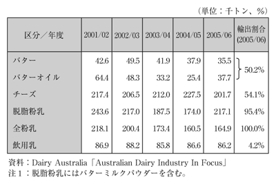 2005/06年度の主要乳製品の輸出量は、国際的な乳製品需要は高かったものの、生乳生産量が微減したことなどから脱脂粉乳、全粉乳以外の品目で前年度の輸出量を下回った。中でもチーズは前年度比11.5%減と大きく減少した。 2005/06年度の乳製品生産量に占める輸出量の割合は、全粉乳が100.0%超(過去の在庫分も含む)、脱脂粉乳が95.4%、チーズが54.1%、バター(バターオイルを含む)が50.2%と、輸出量は生産量の過半を占めており、輸出依存度が高いことが読み取れる。 乳製品の輸出先は、日本、東南アジアを含めたアジア地域の合計が、輸出額ベースで全体の65.8%と、圧倒的なシェアを占めた。 特に粉乳類は、還元乳などの需要が多い東南アジア地域向けの輸出割合が高く、脱脂粉乳、全粉乳ともに輸出量全体の約8割がアジア諸国向けに輸出されている。 |