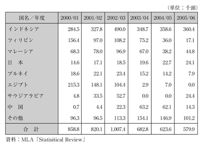 生体牛の輸出については、90年代中頃からインドネシア、フィリピンなど東南アジア向けの肥育素牛を中心に急増した。生体牛の輸出は、97年のアジア経済危機の影響により一時的に減少したものの、その後の順調な経済復興や中東諸国など新規市場の開拓もあって、再び増加基調に転じた。2005/06年度は、牛肉輸出需要のあおりを受けて肉牛価格が上昇傾向にあったことが影響し、前年度比7.0%減の58万頭と減少した。 2005/06年度の豪州の1人当たりの牛肉消費量は、価格が上昇する中で、好調な経済を反映して前年度同の35.9キログラムを維持した。しかし、近年では、健康志向や低価格を反映して鶏肉が伸びており、食肉の中では鶏肉(38.0キログラム)の消費量が最も多く、次いで牛肉、豚肉(22.2キログラム)、羊肉(13.0キログラム)の順となっている。 |