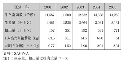 アルゼンチンは、世界の牛肉生産量の約5〜6%を占めている。同国の肉牛生産は、肥よくなパンパ地域を中心に、アンガス、ヘレフォードを中心としたヨーロッパ品種およびその交雑種を主体とした牧草による放牧肥育が一般的である。同国は、1人1年当たりの牛肉消費量が60キログラムを超える大消費国であるとともに、2005年は国内生産量の約24%を輸出している。 なお、アルゼンチンは2004年5月、国際獣疫事務局(OIE)からアイスランド、ウルグアイ、シンガポールとともにBSE清浄国として暫定的に承認された(その後、2007年5月にオーストラリア、ニュージーランド、ウルグアイ、シンガポールとともに「無視できるリスク国」と評価された)。また、南緯42度以北が口蹄疫ワクチン接種清浄地域のステータスを回復し、2007年1月19日から実行された。 |