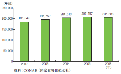 2005/06年度トウモロコシ生産量は前年比21.0%増の4,250万トンとなり、前年度の降雨不足の影響で大幅に減少した生産量が回復した。このうち、400万トンが輸出され3,700万トンが国内市場に供給された。一方、大豆の生産量は同5.2%増の5,500万トンに達し、大豆(豆)として2,495万トン、大豆かすとして1,233万トン、大豆油として242万トンが輸出された。 |