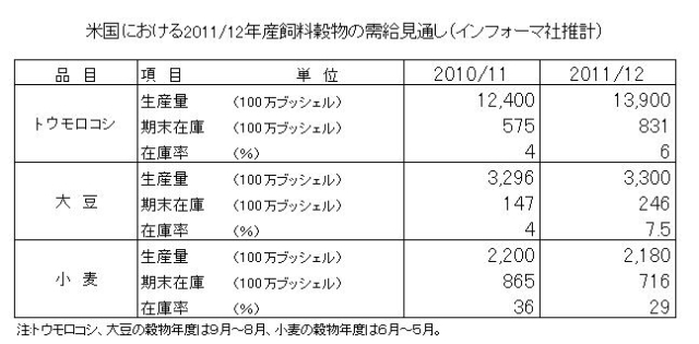 インフォーマ・エコノミクス社(米国の農業コンサルタント)は4月13〜14日、ワシントンD.C.において「食料・農業ポリシーカンファレンス」を開催し、米国の飼料穀物の需給見通しなどを公表した。 なお、米国農務省(USDA)による2011/12年産の需給予測は、5月11日に公表される予定である。