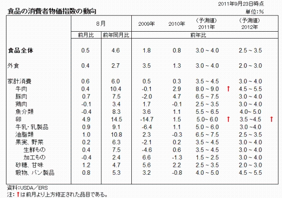 2012年の食品全体のCPIの上昇についてUSDA/ERSは、前年比2.5〜3.5%の上昇と、前年と比べると弱まるものの、過去20年の平均をわずかに上回ると予測している。また、食品全体のうち、外食は同2.0〜3.0%、家計消費は同3.0〜4.0%上回ると予測されている。なお、これらはいずれも前月公表の数値から据え置かれている。家計消費のうち品目別では、卵について採卵鶏の減少に伴い上方修正された。