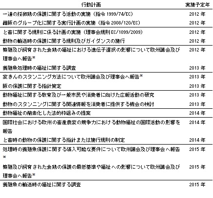 現在、2006年1月に欧州委員会より公表された、以下の5分野から構成される2006年〜2010年の5年間のアニマルウェルフェアの行動計画に基づき取り組んでいる。