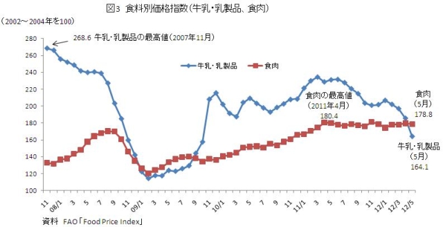 注1:FAOの食料価格指数(Food Price Index)は、穀物、油脂、牛乳・乳製品、砂糖および食肉の国際価格について、2002〜2004年を100とし、食品全体の平均価格を指数化したものである。
