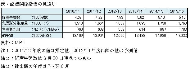 MPIは、2015/16年度までの中期的な予測として、新興国の需要などで乳製品の国際価格は堅調に推移すると予測している。そのため、2015/16年度の生乳生産量については、2011/12年度比6.3%増の176万8000トン、乳価については同28.8%高の7.83NZドル(478円)と順調な成長を予測している。