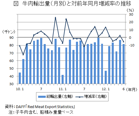 なお、2012年6月の牛肉輸出量(子牛肉含む。船積み重量ベース)は8万1586トン(前年同月比5.1%減)となった。このうち日本向けが3万315トン(同4.1%減)、米国向けが1万7342トン(同0.8%増)、韓国向けが8,888トン(同22.0%減)となっている。