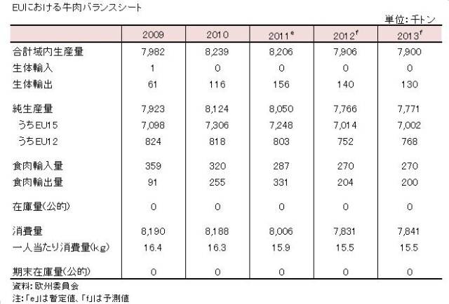 牛の飼養頭数は、2008年以降年平均1.1%減で推移しており、今後もこの傾向は継続するものとみられる。2012年の牛肉生産量は、前年比3.5%減となる見込みである。供給が不足すると見込まれていることから2012年も牛肉価格は高水準で推移するものとみられる。国内需要の減少とユーロ安の影響で、2012年の輸入量は前年比5.8%減の見込みである。輸出は、生産能力の低下により大きく減少するものとみられる。結果的に、2011年は純輸出国であったEUは、2012年、2013年は純輸入国に転じる見込みである。
