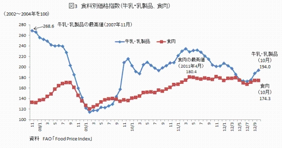 注1:FAOの食料価格指数(Food Price Index)は、穀物、油脂、牛乳・乳製品、砂糖および食肉の国際価格について、2002〜2004年を100とし、食品全体の平均価格を指数化したものである。