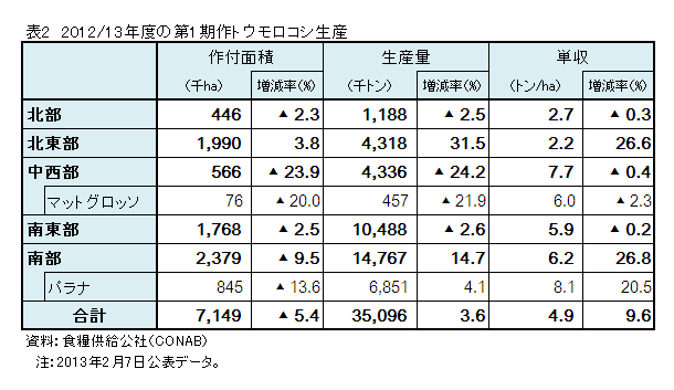 第1期作トウモロコシの作付面積は、主に中西部で大豆の作付けに転換されたため、前年度比5.4%減の1542万ヘクタールと見込まれている。また南部では、トウモロコシは既に結実期〜登熟期にあり、前年と異なり、干ばつの影響を受けていない。このため、作付面積が減少したにもかかわらず、生産量は同3.6%増の3510万トンと見込まれている。