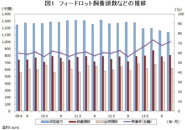 MLAは、2014年のフィードロットの平均飼養頭数を、2013年1〜9月平均から9パーセント減の75万頭程度になるとみている。これは、2014年も穀物価格が高値で推移するとみられることや、肥育もと牛の供給減少により、もと牛価格の上昇が見込まれることに基づく予測である。MLAは、2014年の飼養頭数について、過去と比べるとなお高い水準としているものの、今後、飼養頭数の減少によりグレインフェッド牛肉が減産すれば、 日本向けと他市場向けとの競合が強まることも予想される。