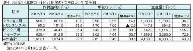 CONABでは、生産量の大幅な伸びが期待される地域として、これまでと同様に北東部を中心としたマトピバ地域を挙げており、作付面積と単収の増加を受け、2013/14年度の同地域の生産量は国内全体の生産量の約9%に相当する688万トン(同63.9%増)まで拡大するとみている。